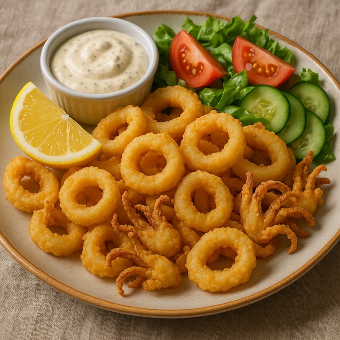 Fried squid rings in a crispy crust.