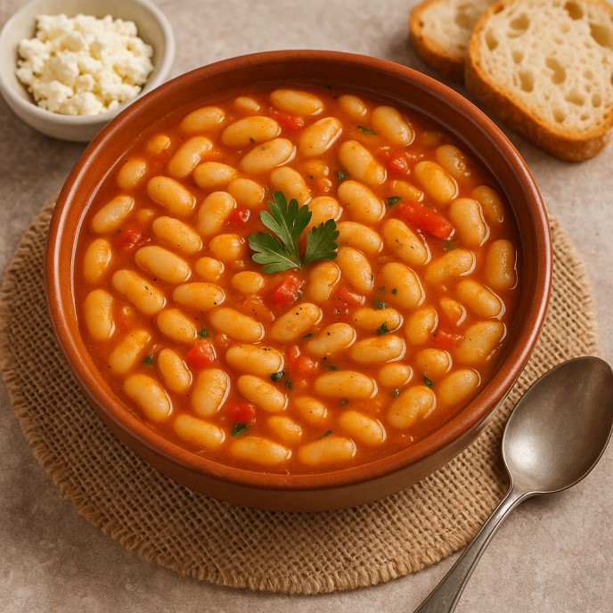 A classic Greek hearty soup made with white beans, carrots, tomatoes and olive oil.