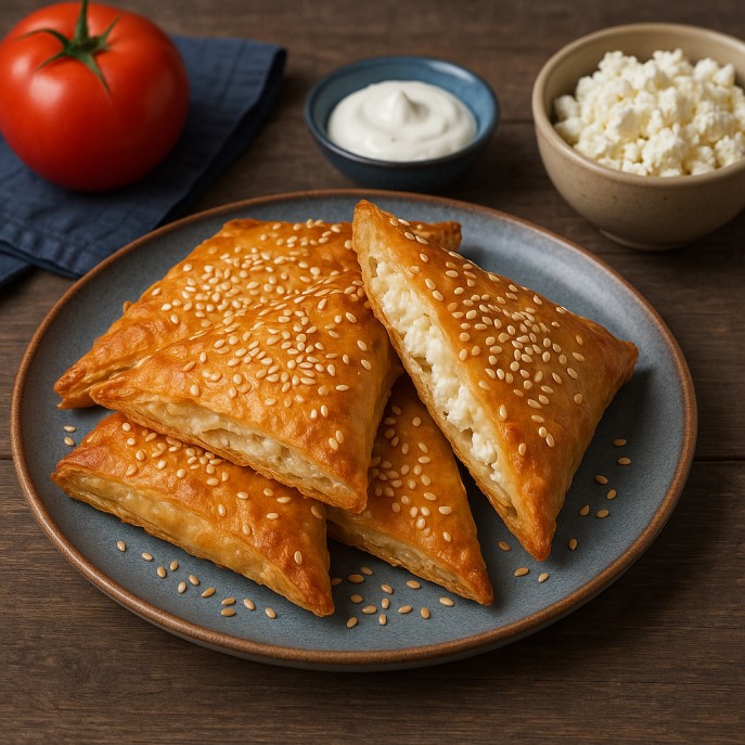 Puff pastries with feta cheese or a mix of cheeses, baked in crispy filo pastry.